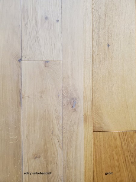 Sortierung Asteiche: naturgewachsen mit Farbunterschieden, Oberseite ohne Splintholz, selten kleine Hobelfehler und Insektenfraßstellen, offene Äste und Risse mit wasserfestem Klebharz geschlossen, weiche Äste durch neue ersetzt